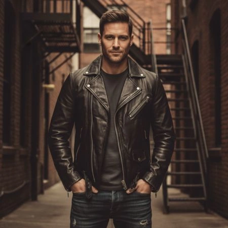 Pose Ideas: Hands in pockets, jacket slightly unzipped, subtle smirk toward the camera.