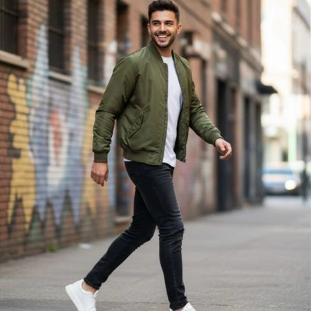 Outfit: Bomber jacket, solid tee, slim-fit jeans, and sneakers.