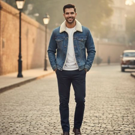 Outfit: Blue denim jacket with fur collar, white tee, and dark chinos.