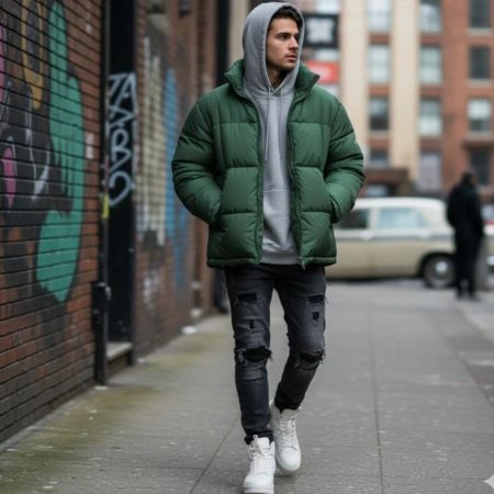 Outfit: Oversized puffer jacket layered over a hoodie, styled with joggers or ripped jeans.