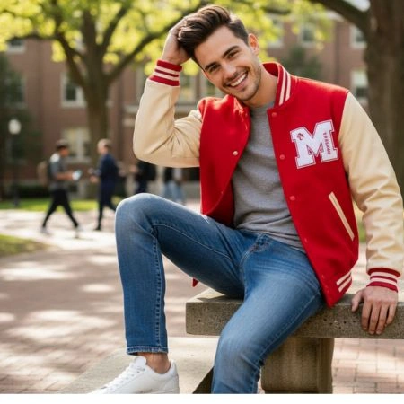 Outfit: Letterman-style varsity jacket with jeans and sneakers.